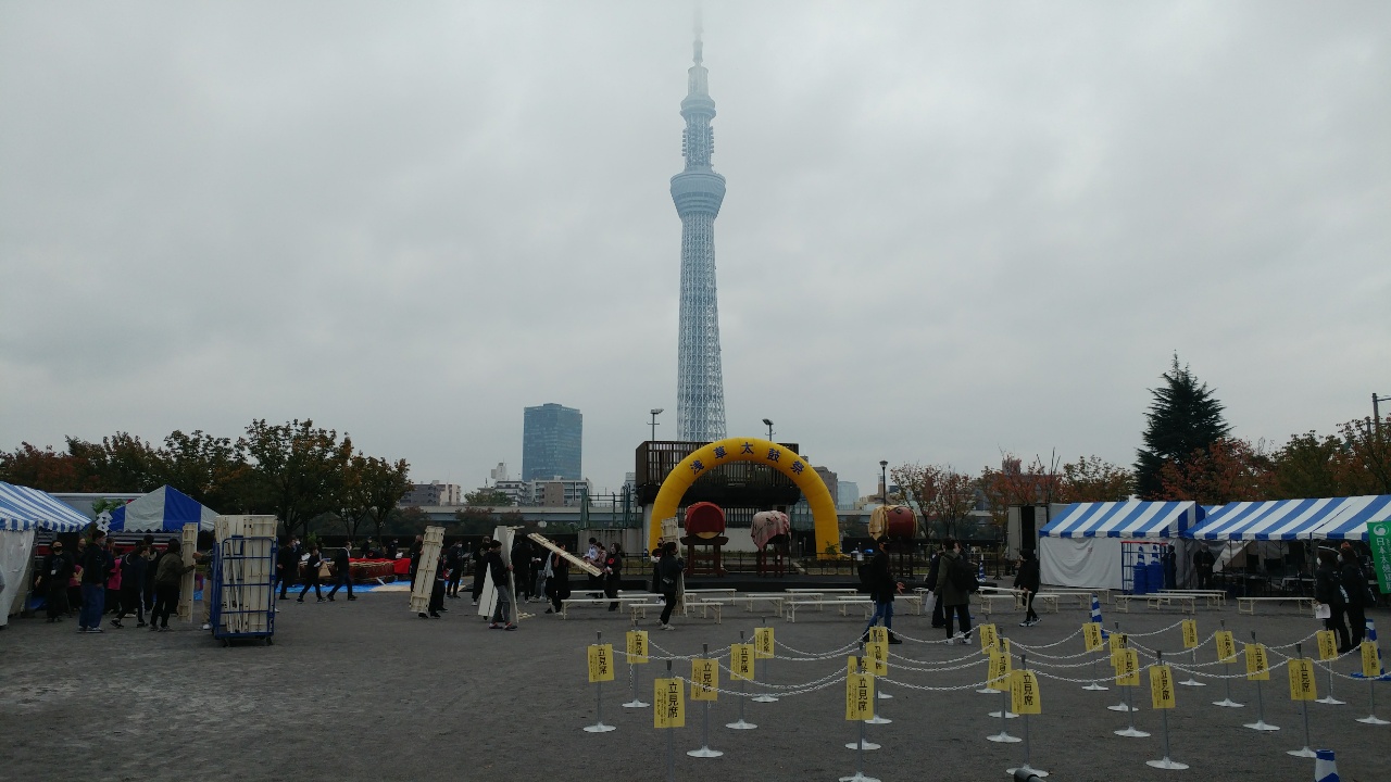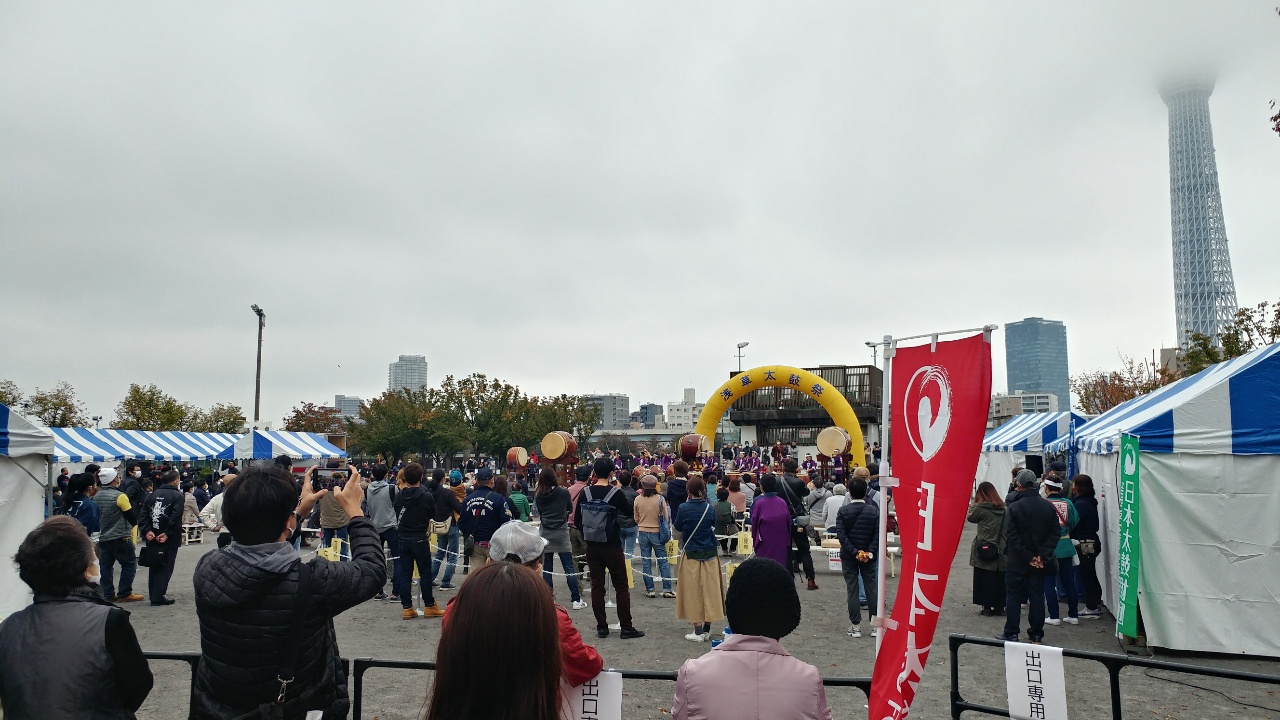 桜橋を渡ると、準備中の太鼓祭に出くわす。浅草界隈を歩いていて、時々ポスターを見かけたのはこれだったか。思っていたより大掛かりである。もっと地味なイベントかと思っていた。