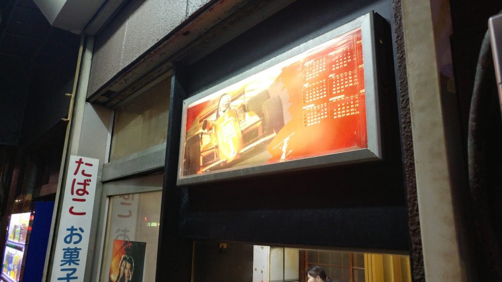 何気ないタバコ屋の店先の看板だが、カレンダーの日付と曜日の対応から推察するに、おそらく1985年のものと思う。写真のフォーミュラーカーは星野一義の操る1984年の全日本F2選手権出場車両ではないか(といって、モータースポーツにはさして明るくないので、違っていたら失礼)。35年前のカレンダーを堂々と掲げているのも浅草的な大らかさか。