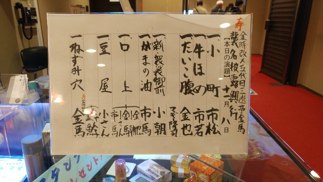 しっかり聞かせた。初日に聞いた「柳田格之進」もよかったが、武士と町人とが交わったために翻弄される人々の悲劇であり、やや肩が凝る。今日のネタは町人の物語だが、兄弟の生きざまの違いが根底にある。兄が弟に商売の元手として貸した額が三文だとか、弟は所帯を構えて幼い娘がいるのに対して、兄は食い扶持がかかるだけだと妻子を持たないというのは、物語上の実話なのだろう。結果的には弟の身代は無事で何よりなのだが、この生きざまの違いは残る。