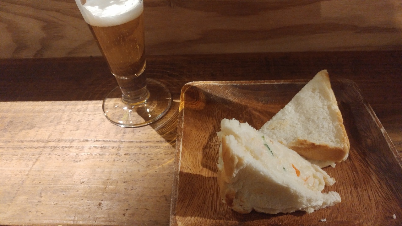 朝の分と合わせて1万歩になったので始めた。まず生ビールとポテトサラダのサンドイッチ。
