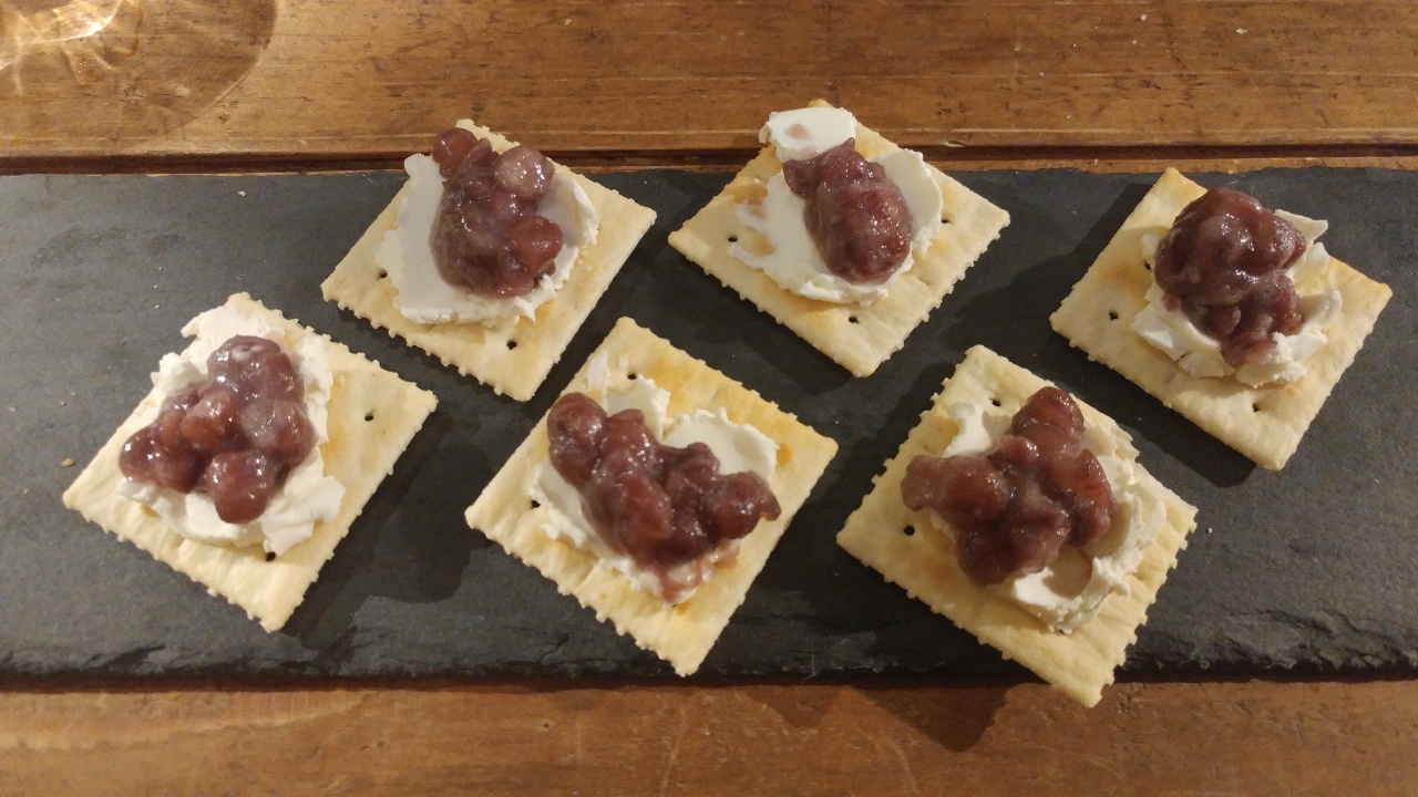 お酒を生ハイボールに替えて、つまみはゆであずきとチーズのカナッペ。こうなったら、とことんゆであずきで行く。