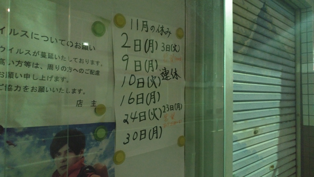 さて、件の銭湯に着くと明かりがついていない。玄関に掛かった板には「ぬ」の一文字。お湯を「ぬ」いた、の意である。月曜定休と思っていたら、月曜が祝日の場合は営業して、代わりに翌日の火曜が休業になるようだ。残念。