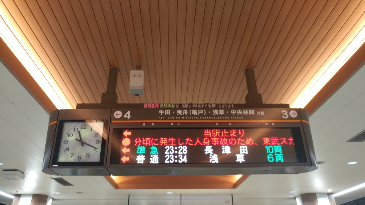 東武線内で事故があったらしく、半蔵門線との直通運転は休止していたが、北千住に出る分には構わない。