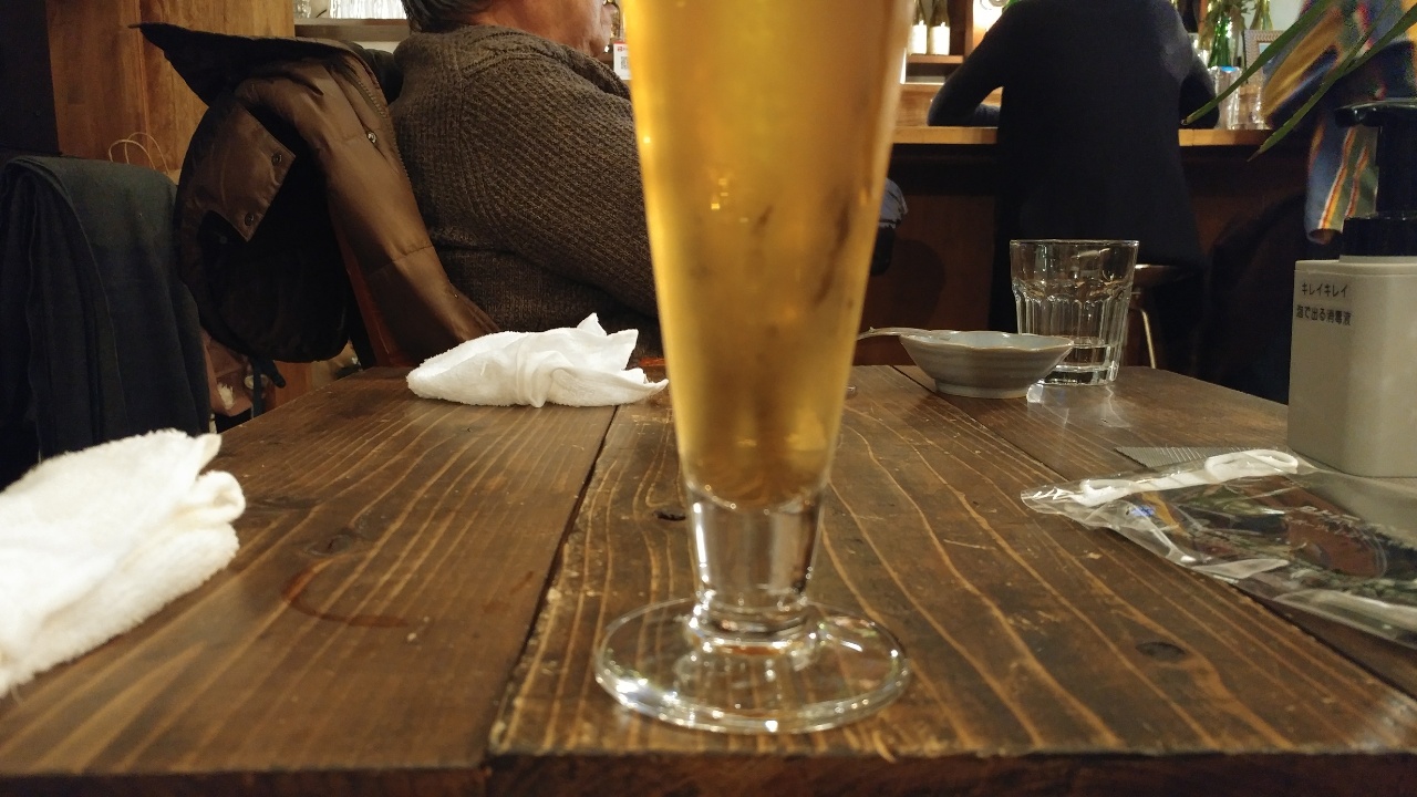 湯上がりに生ビールから始めた。前に見えるのはマスターの義父、つまりマスターと一緒にお店に出ているご夫人のお父さんである。だいたい毎晩ここで飲んでいるご様子。