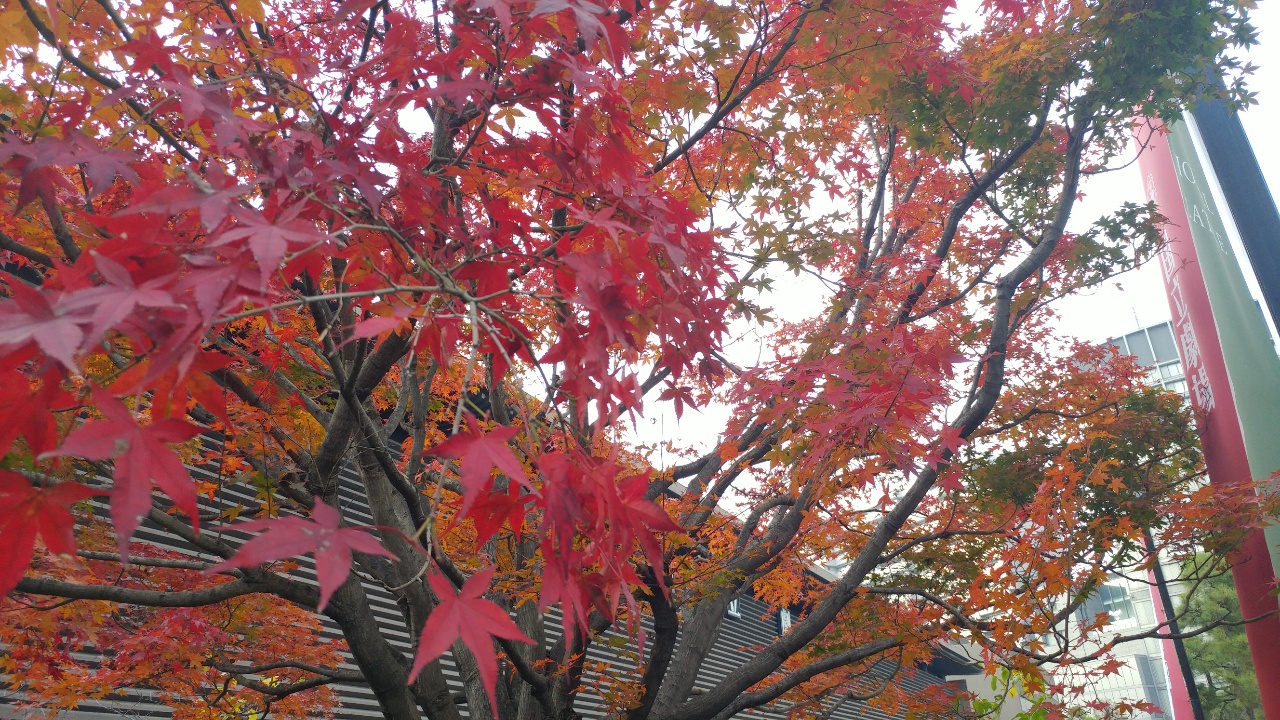 国立劇場へ。前庭のヤマモミジが紅葉していた。見たところ前庭の紅葉はこの一本だけのよう。