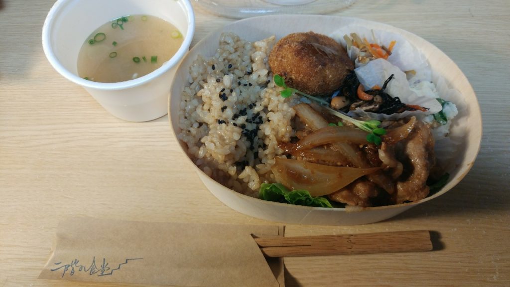 灯油を家に置いてから、昼飯を買いに出直し。二階の食堂へ。今日は豚しょうが焼き弁当にした。