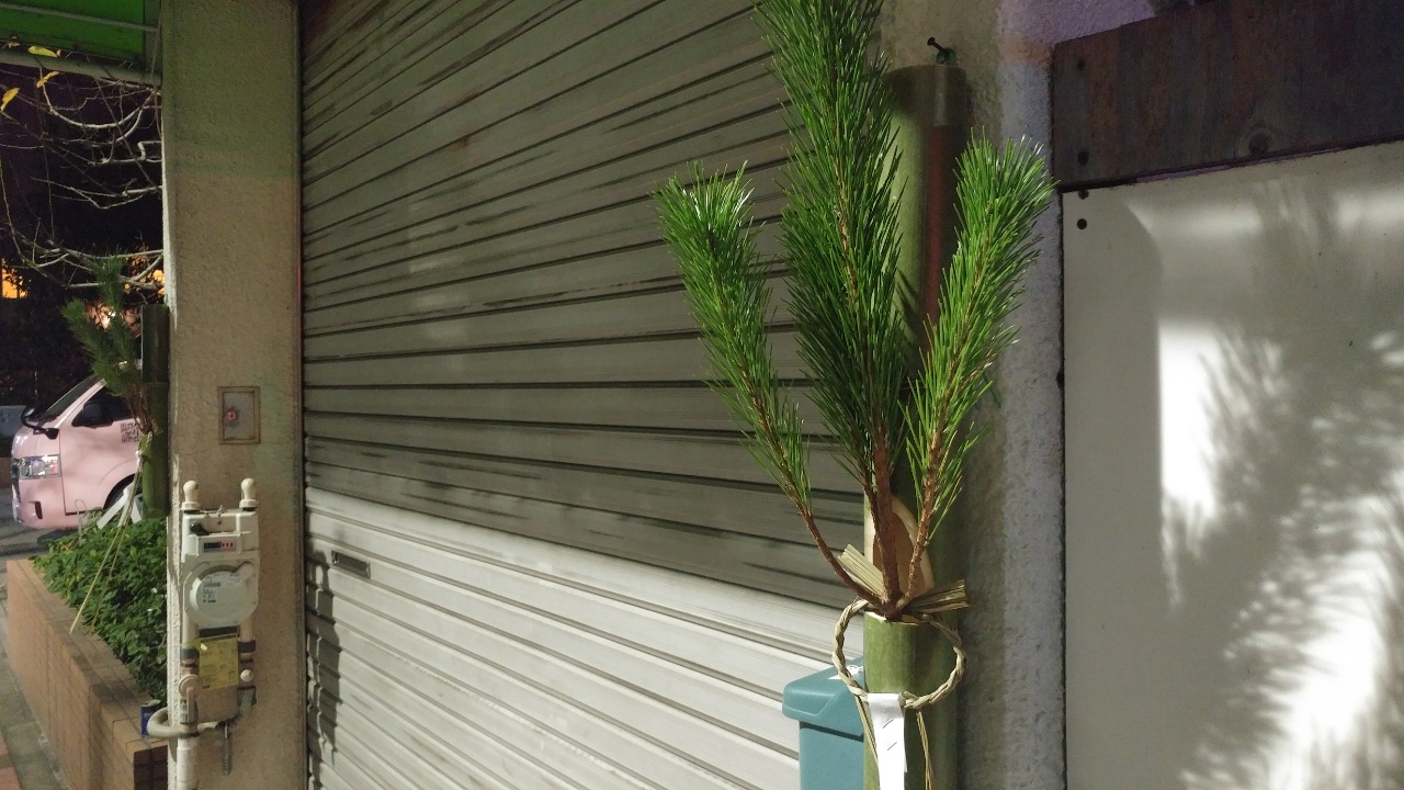 正月の松飾りを見た。今シーズン初。何か商売をしている家かな。