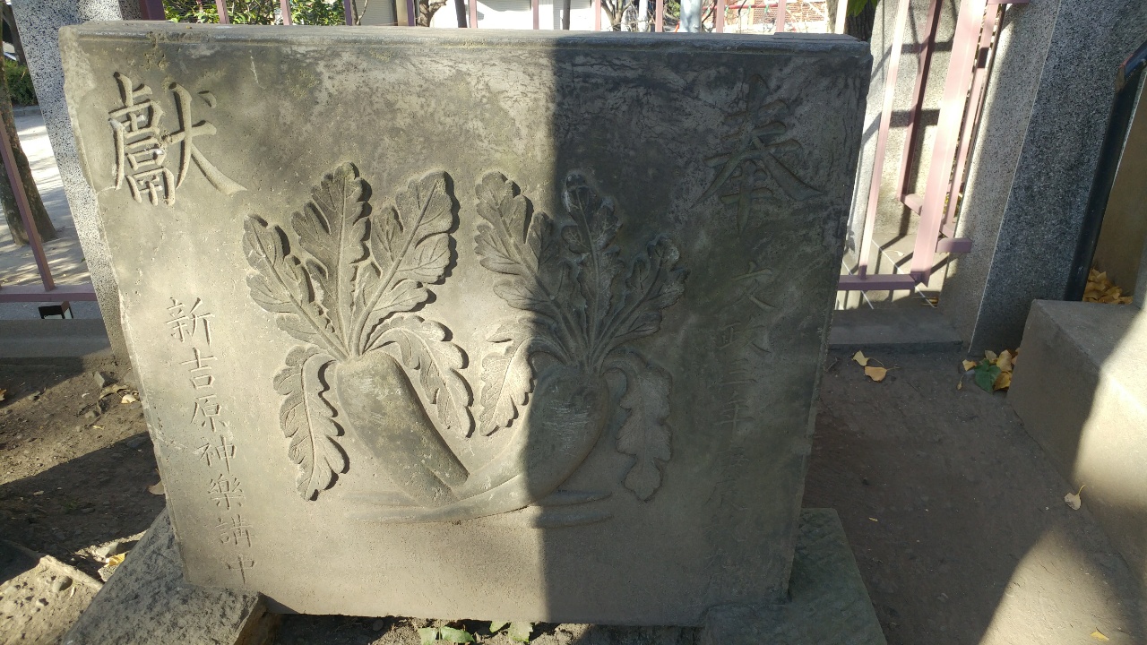 「奉献 文政三年庚辰秋九月 新吉原神楽講中」と読める。文政三年は1820年。神楽講中というのはよく分からなかったが、神楽が講(信徒集団か)を通じて受容されていたのだろうか。現代の東京が江戸と地続きだったことを思い出させる。