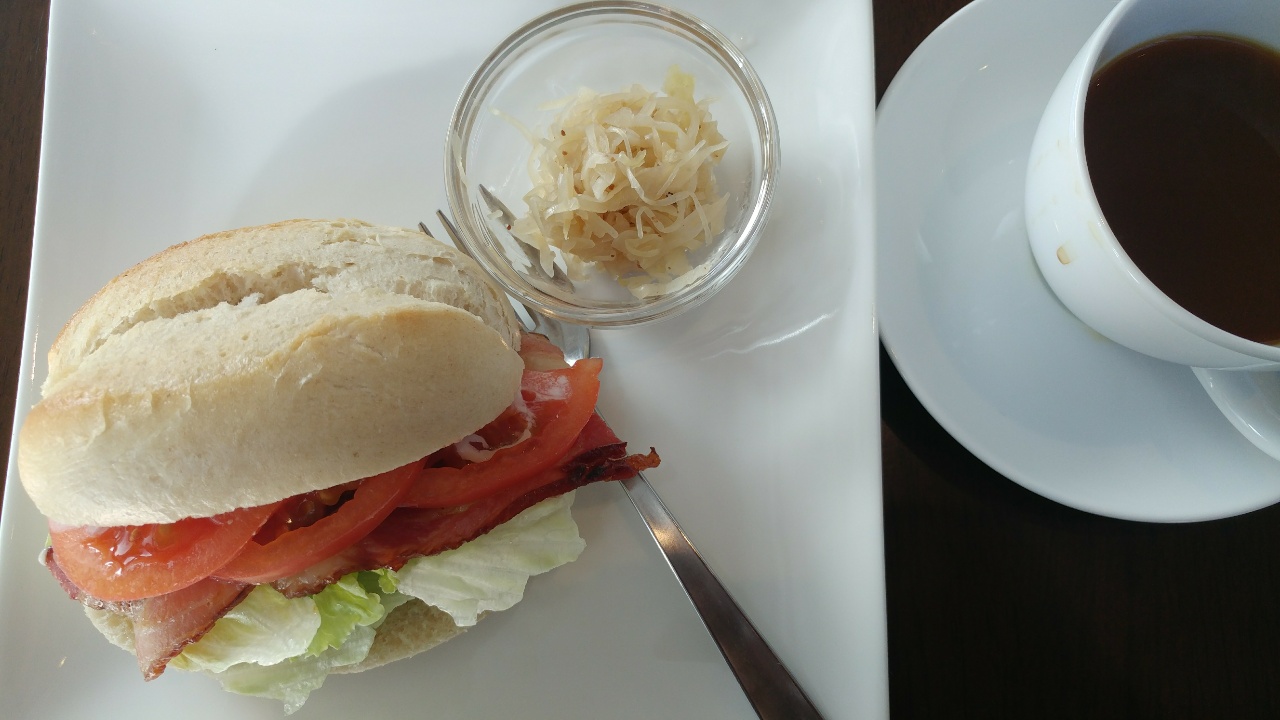 通り沿いのカフェで朝飯がてら休憩。BLTサンドとコーヒー。この後向かいのパン屋でクロワッサン(普通のとチョコバナナクロワッサンというもの)を買った。