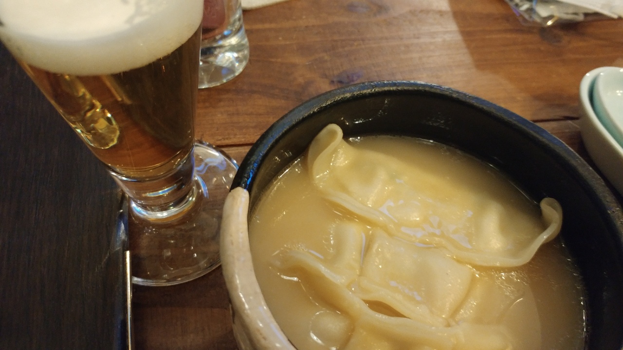 生ビールと水餃子。その後、生ハイボールとピクルスに替えて続けた。