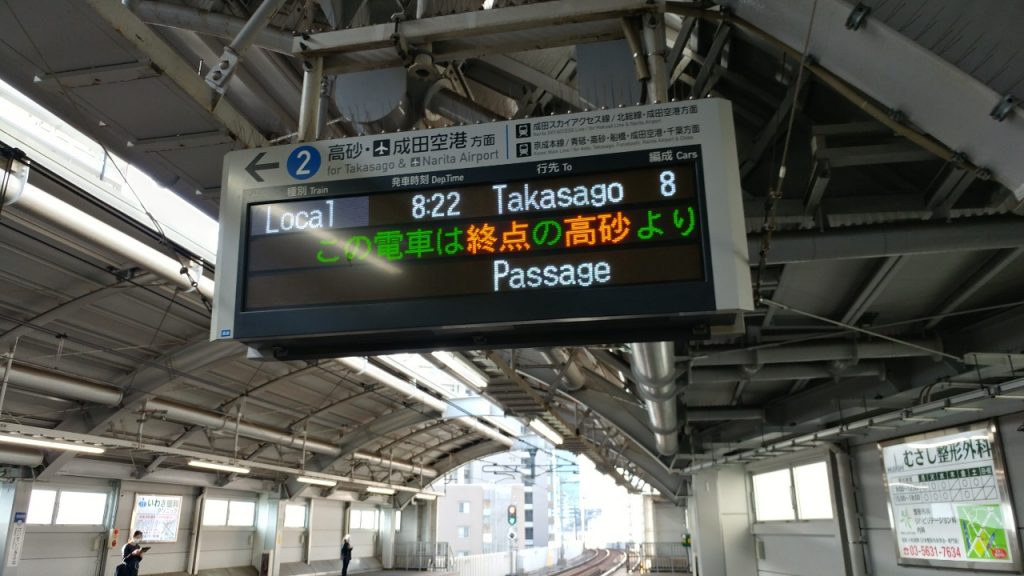 8時22分発の電車は高砂行と表示されているが、実際は高砂で同じ電車がそのまま京成佐倉行の快速に切り替わる。しかし、それなら最初から京成佐倉行と表示しておけばいいのに。何か不都合があるんだろうか。一瞬乗換案内が間違っていたかと思ってしまった。