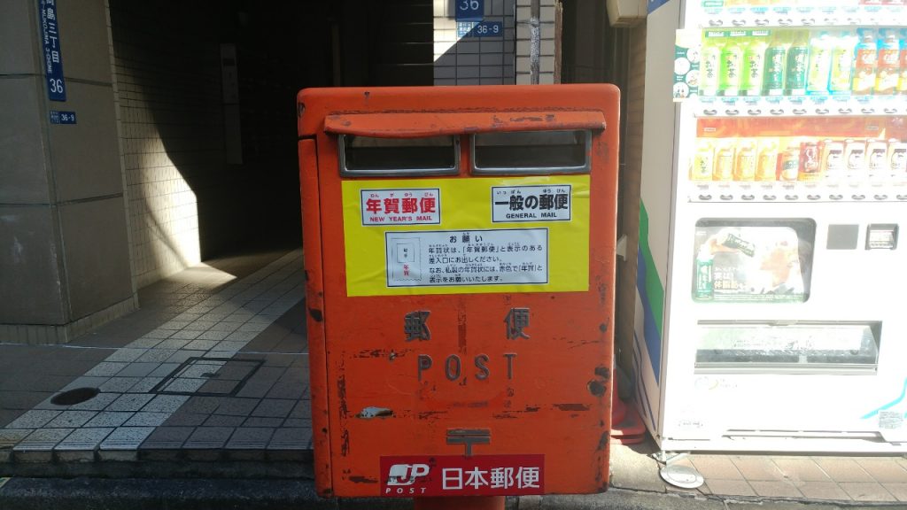昼間、巣ごもりから抜け出す。郵便ポストに年賀状用の投函口ができる時期になった。