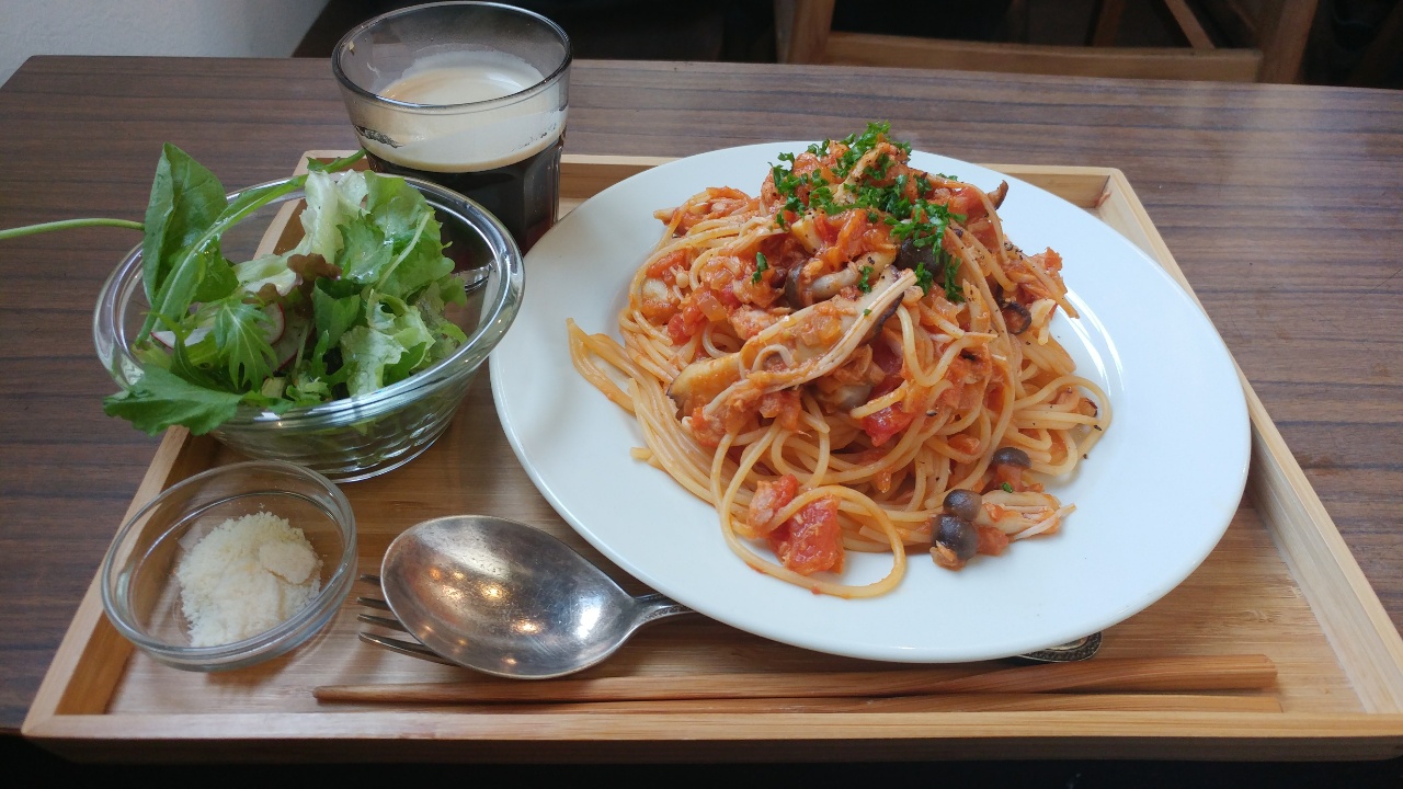 朝飛ばしで昼飯。二階の食堂で、トマトソースのスパゲッティ。前回金曜日に伺った時もスパゲッティだったが、金曜日の日替わりランチはスパゲッティに決まっている模様。