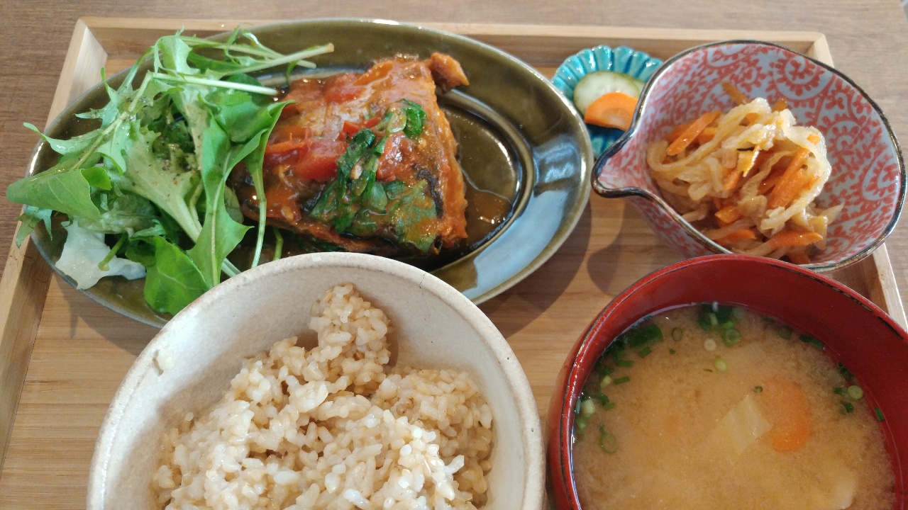 昼は二階の食堂の日替わりランチ。今日は、さばのトマトみそ煮。